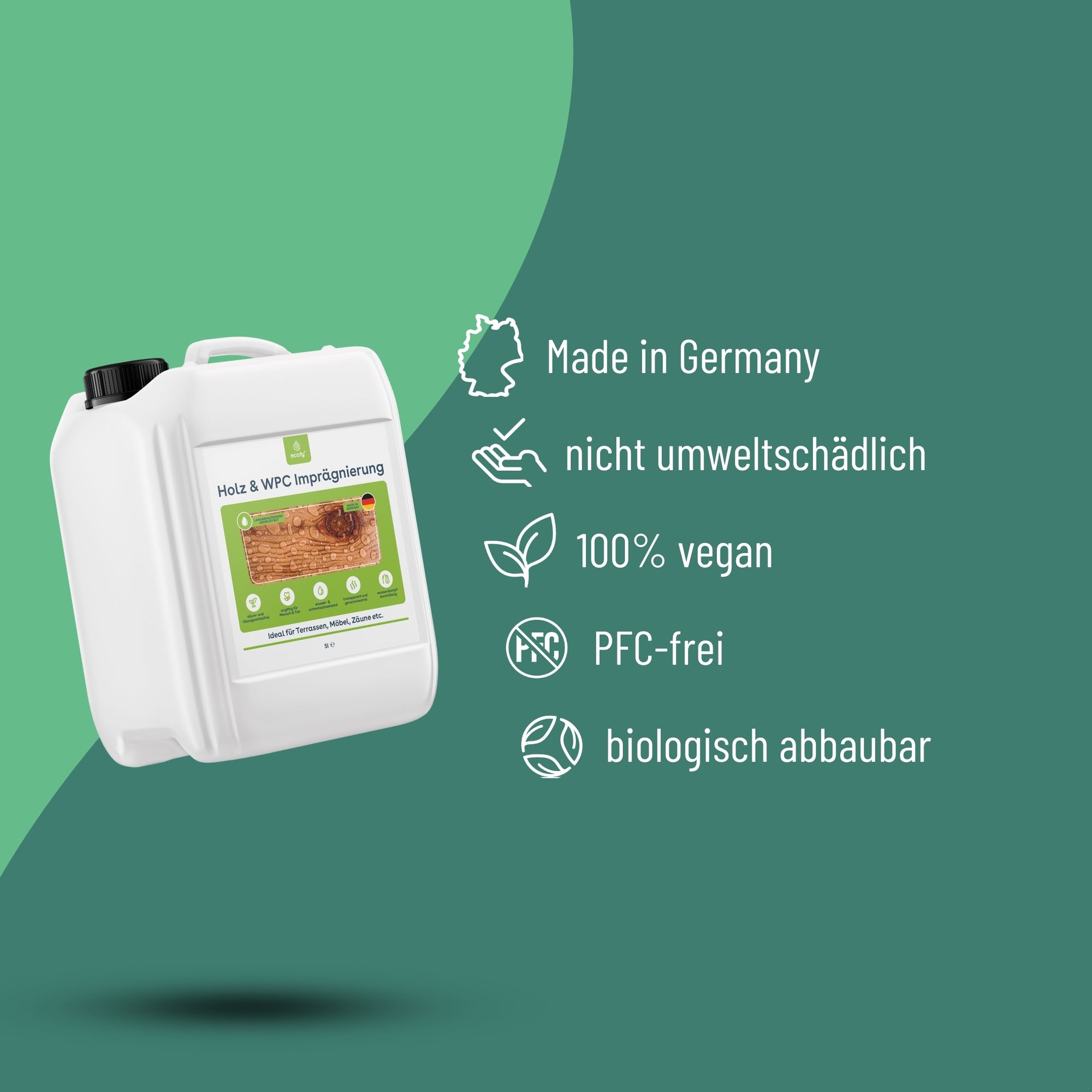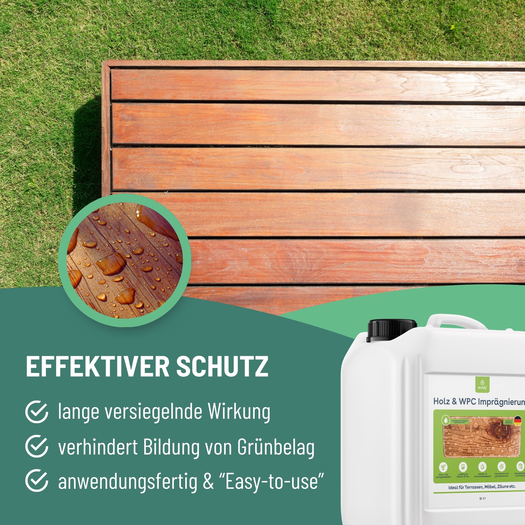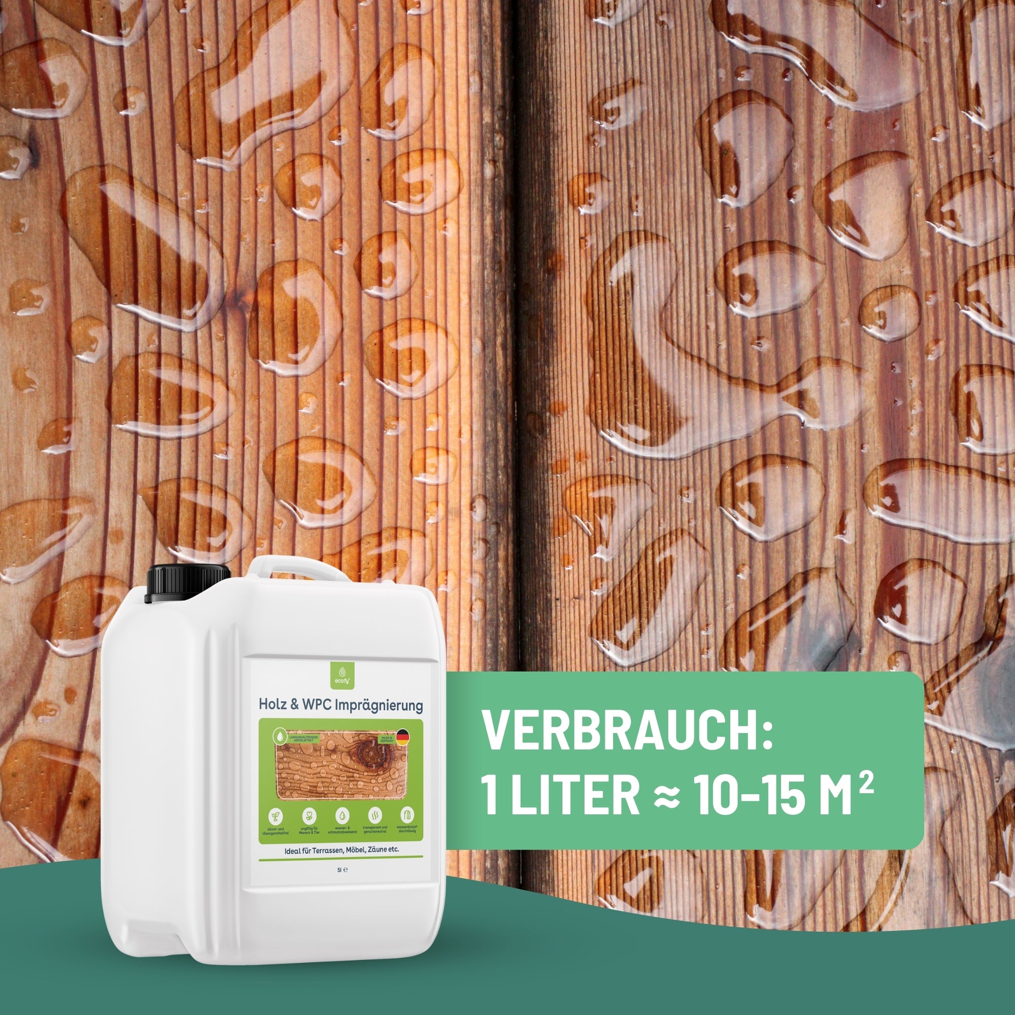 Mit der eco:fy Holz- und WPC-Imprägnierung können Sie Holz- und WPC-Oberflächen zuverlässig vor den Auswirkungen von Feuchtigkeit, Verwitterung und Verunreinigungen schützen. Die behandelten Oberflächen sind resistent gegenüber Nässe, Wetterbedingungen und Verschmutzungen, wodurch Öle, Fette und andere Verunreinigungen nicht in das Material eindringen können. Stattdessen bleiben die Verschmutzungen oberflächlich und können einfach entfernt werden. Darüber hinaus wird auch die Bildung von Grünbelägen, Moose und Algen verhindert, da diese keine Flächen zum Anhaften auf dem behandelten Material finden. Die Luftdurchlässigkeit des Holzes oder WPC bleibt erhalten, was für eine gesunde Umgebung sorgt.