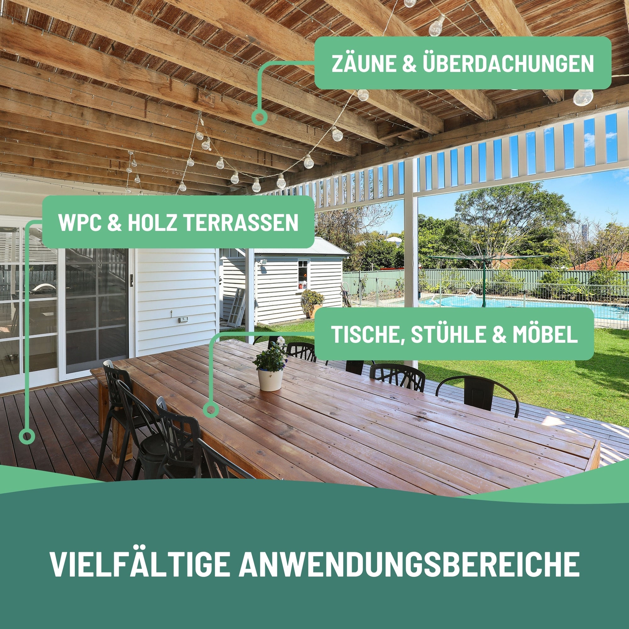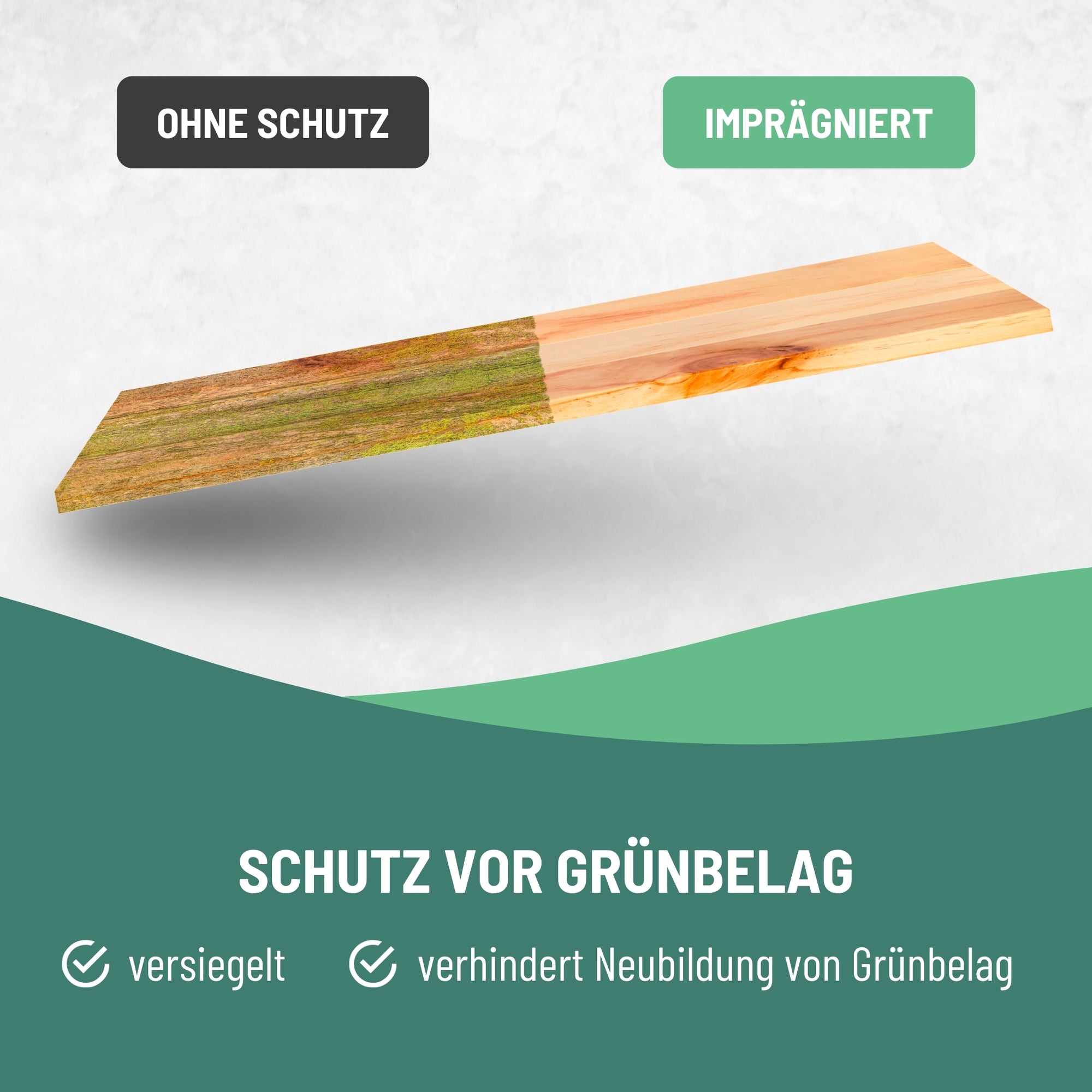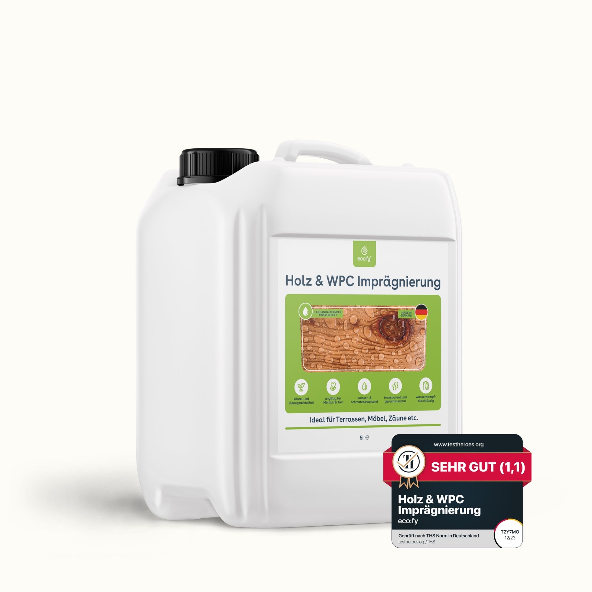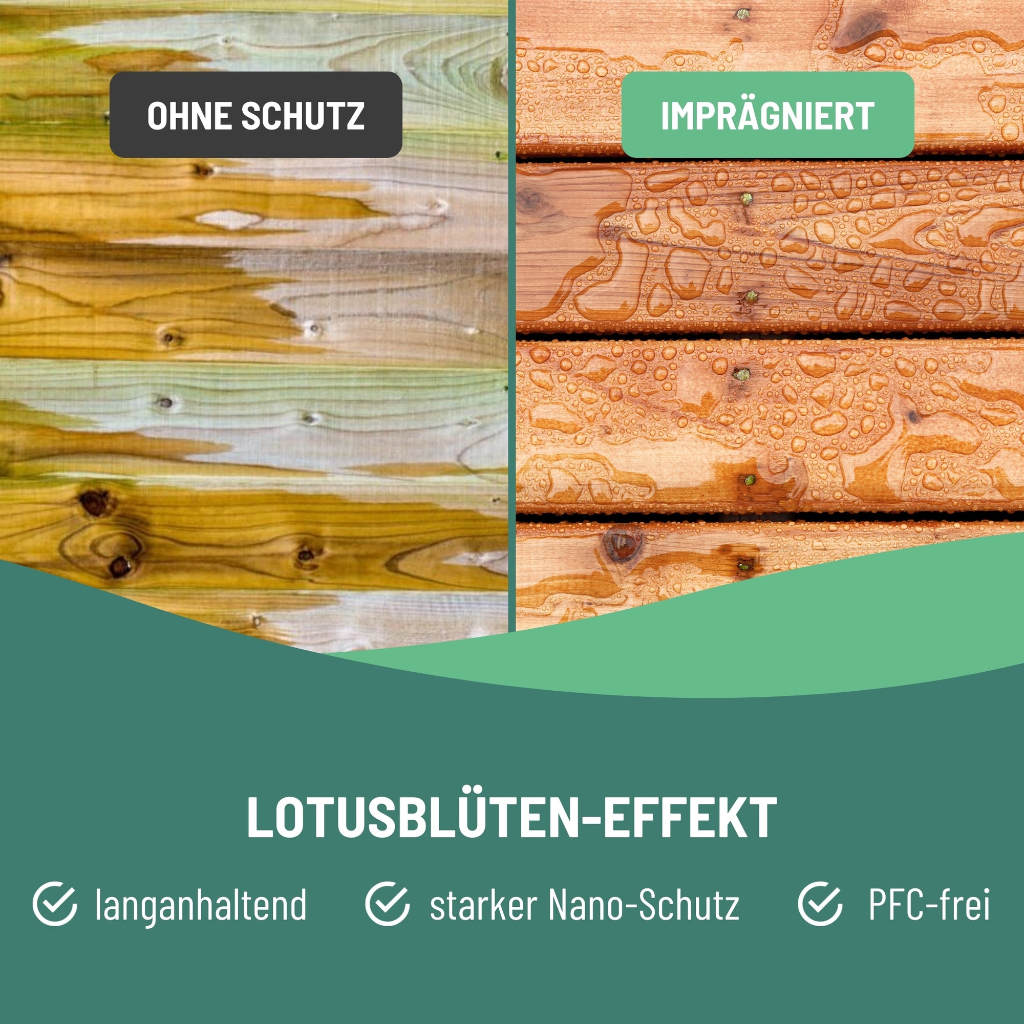 Mit der eco:fy Holz- und WPC-Imprägnierung können Sie Holz- und WPC-Oberflächen zuverlässig vor den Auswirkungen von Feuchtigkeit, Verwitterung und Verunreinigungen schützen. Die behandelten Oberflächen sind resistent gegenüber Nässe, Wetterbedingungen und Verschmutzungen, wodurch Öle, Fette und andere Verunreinigungen nicht in das Material eindringen können. Stattdessen bleiben die Verschmutzungen oberflächlich und können einfach entfernt werden. Darüber hinaus wird auch die Bildung von Grünbelägen, Moose und Algen verhindert, da diese keine Flächen zum Anhaften auf dem behandelten Material finden. Die Luftdurchlässigkeit des Holzes oder WPC bleibt erhalten, was für eine gesunde Umgebung sorgt.