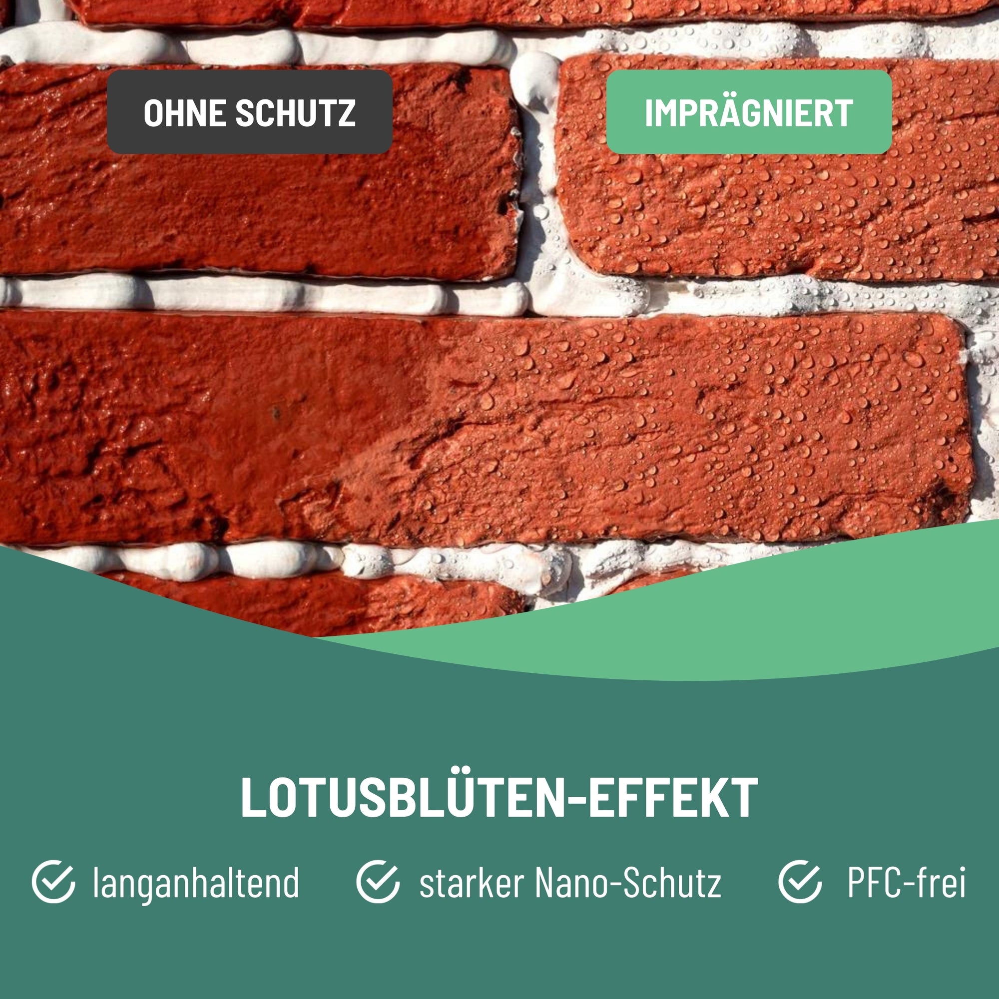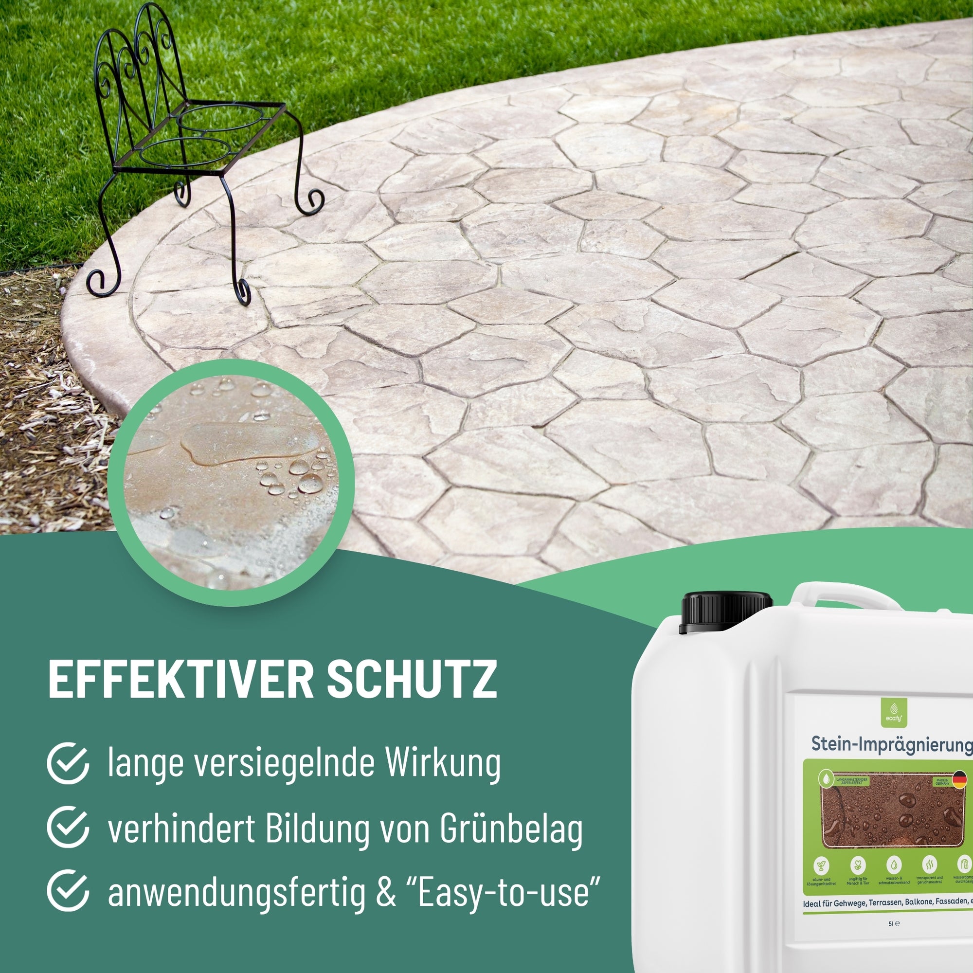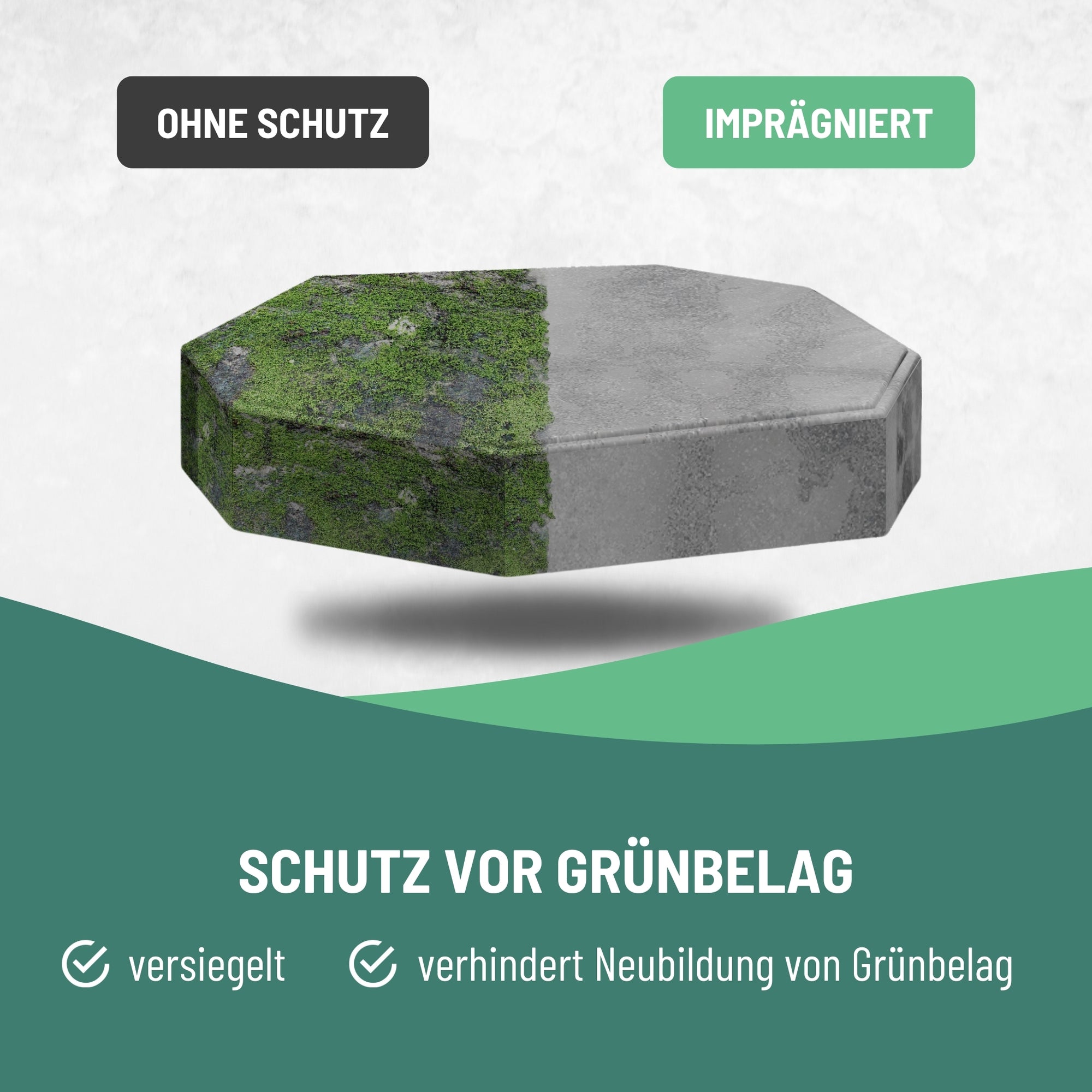 Die Steinimprägnierung ist eine wirksame Lösung für poröse oder saugende mineralische Untergründe. Sie ist atmungsaktiv und verändert die Optik des behandelten Materials nicht. Die Oberflächen behandelter Materialien werden nicht rutschig oder klebrig und erhalten durch die Imprägnierung eine unsichtbare Widerstandskraft gegen Wasser und Schmutz. Verschmutzungen gelangen weniger in die Poren, was sie leichter zu reinigen macht. Die Durchnässung wird verhindert und Schäden durch Frost vorgebeugt. Die Trocknungszeiten nach Regen werden drastisch verkürzt und die Oberfläche wird weniger anfällig für Flechten, Moose und Grünbelag.