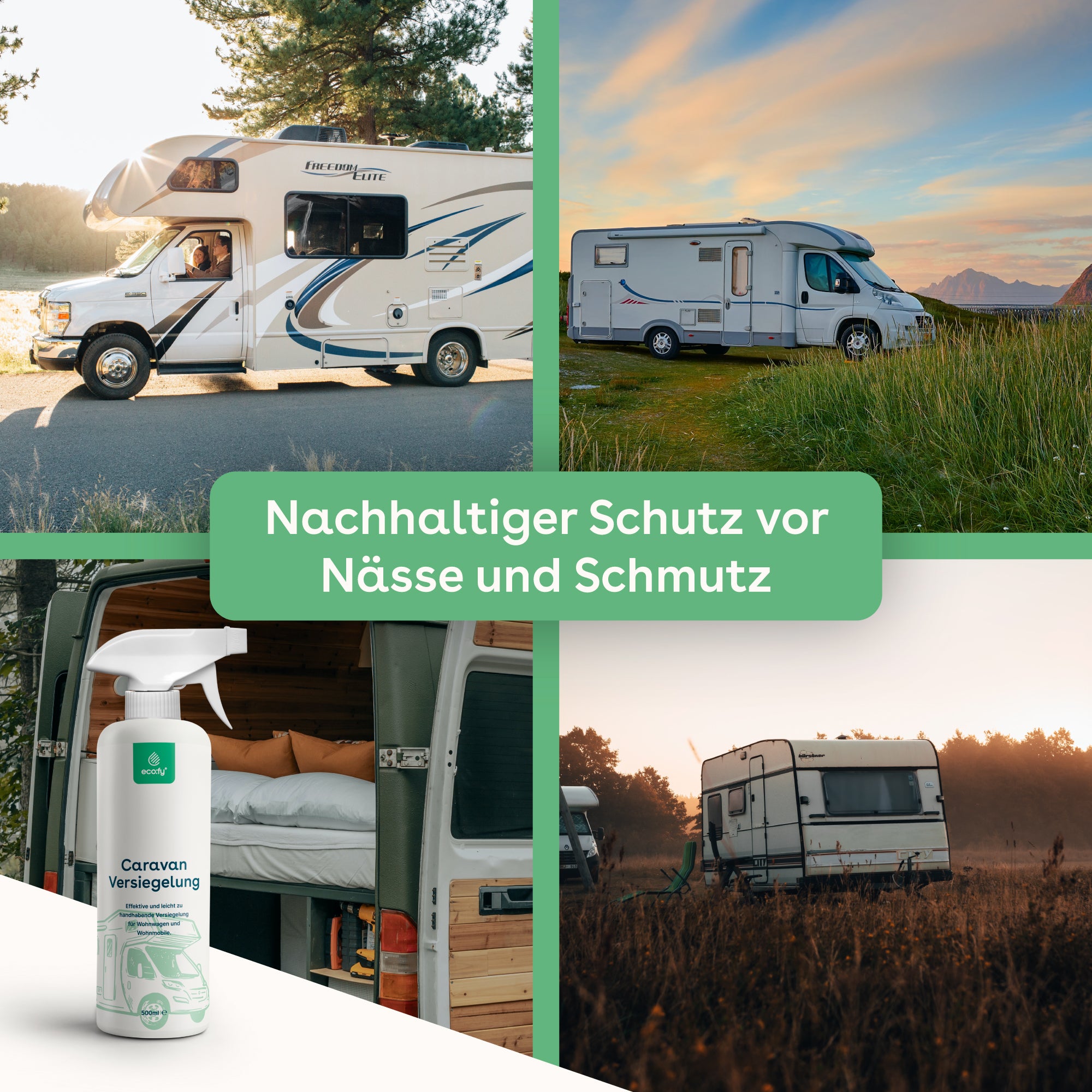 Mit dieser Caravan-Versiegelung legt sich ein unsichtbares Schutzschild auf die Oberfläche, welches schmutzabweisend wirkt und die Reinigung erleichtert. Diese Imprägnierung ist vielseitig einsetzbar und eignet sich für z.B. Wohnwagen, Caravans, Wohnmobile, Reisemobile, Campingbusse, Campervans und vieles mehr. Dabei sorgt sie für eine schöne Farbtiefe und steigert den Glanz der Oberfläche.