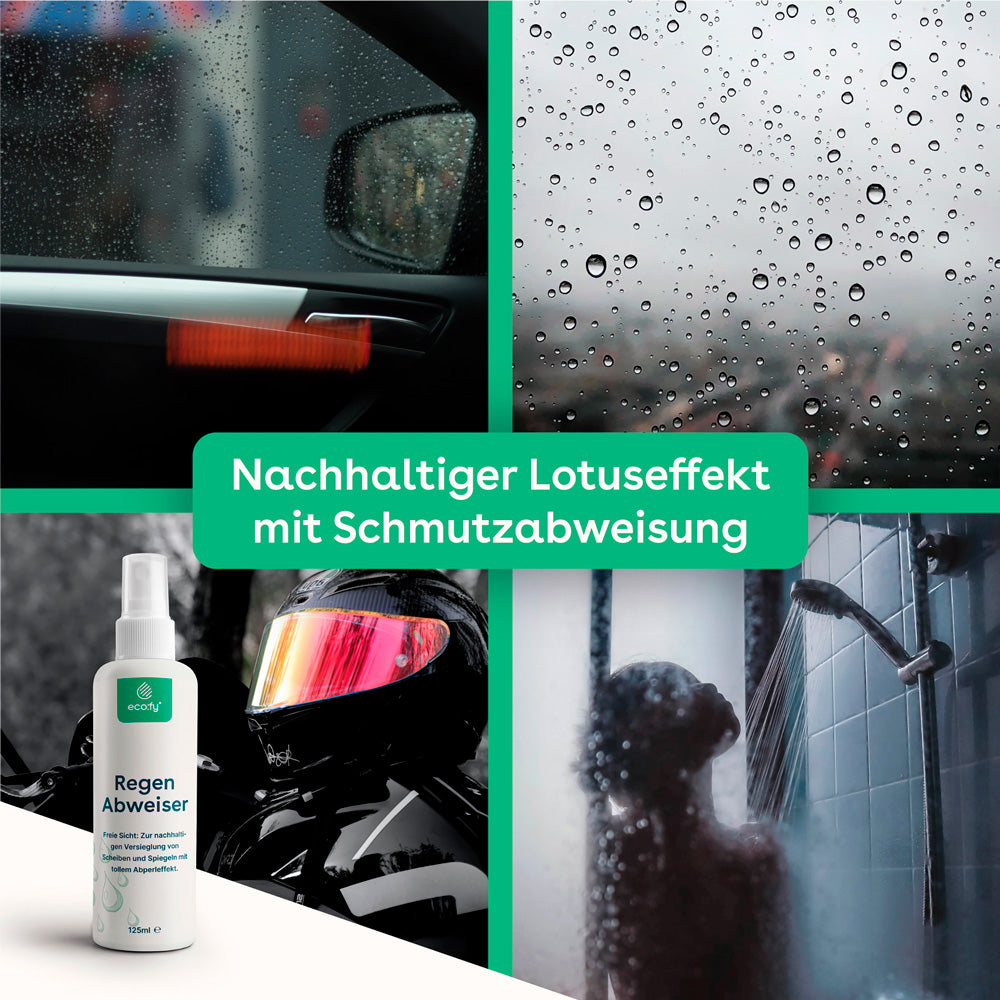 With the rain deflector you can coat windshields, mirrors and helmet visors with a water-repellent coating. The spray ensures that the water rolls off the panes effectively and immediately. It is also very suitable for interior tiles or panes, such as shower stalls or mirrors.